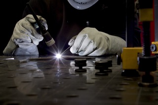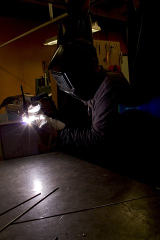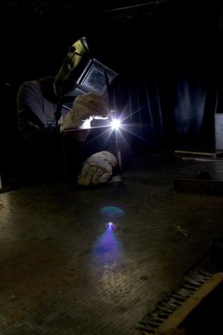 Mara Döhmen fühlte sich vom Licht angezogen, doch ihre Bilder wirken eher mystisch und bedrohlich. Wir sehen Mitarbeiter, die auf Lichtbogenschweißen spezialisiert sind, bei der Arbeit Funken sprühen lassen oder mit dem Bunsenbrenner virtuos Glas formen. Womöglich ist die Düsterkeit der Motive auch der Tatsache geschuldet, dass es ebenfalls für die Fotografin elementar war, zum Schutze der Augen eine dunkle Schweißmaske zu tragen.