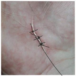 Anja Migge fotografiert menschliche, verletzte oder von außen beeinflusste Haut. Nach dem Druck in unterschiedlichen quadratischen Formaten wurden die Fotos, entsprechend der vom Foto abgebildeten Verletzung oder Beeinflussung, behandelt.