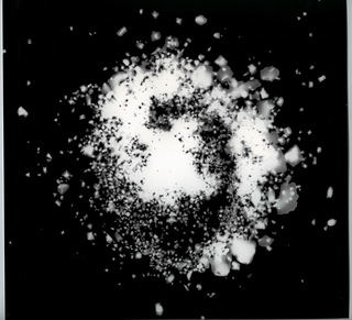 In Lydia Kels' Arbeit Minus 1D 2013.1 rauschen wir scheinbar mit Lichtgeschwindigkeit durch die Tiefen des Universums. Was wir faktisch sehen sind Fotogramme – Ergebnisse eines fotografischen Verfahrens, das ohne Kamera auskommt. Lydia Kels streut dazu Glimmer auf lichtempfindliches Fotopapier, „um“ – wie sie sagt – „die Stofflichkeit wie auch die Reflexionskraft der Oberfläche des vielschichtigen Materials zum Vorschein zu bringen.“ Glimmer ist ein natürliches, gesteinsbildendes Mineral, das Kristalle mit perlmuttartigem Glanz ausbildet, woher sich etymologisch die Namensgebung ableitet. Wegen seiner isolierenden Eigenschaft und des hohen Schmelzpunktes wird Glimmer in der Glasbläserei eingesetzt, um glühend heiße Glaskörper abkühlen zu lassen. Lydia Kels' Intention deutet sich auch in ihrem Werktitel an: Ein Wesensmerkmal der Fotografie besteht in der Reduzierung der realen Welt um eine Dimension ins Zweidimensionale. Dennoch suggeriert uns ein Foto stets einen dreidimensionalen Raum. Das Verfahren des Photogramms gewinnt deshalb für sie an Bedeutung, da das plastische Material in direkten Kontakt tritt mit dem flächigen Fotopapier. So steht die dynamische Tiefenwirkung ihrer Photogramme im besonderen Kontrast zur Statik des Bildträgers.