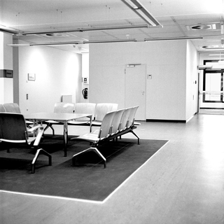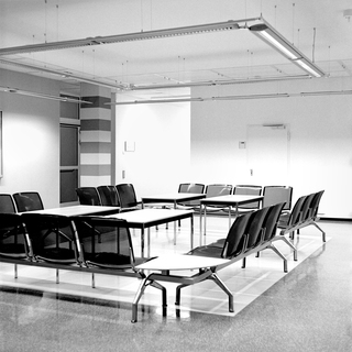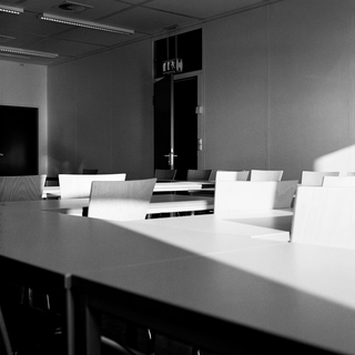 Die Orte haben etwas klinisch Reines, so wie sie Marian Büsing darstellt. Sie wirken ein wenig wie ein Architekturmodell universitärer Räume. Verkleinert, unwirklich und menschenleer. Marian Büsing untersuchte gerade nicht das typische Aussehen oder Verhalten und Gewohnheiten seiner Kommilitonen, sondern stellt die Hochschule als leere Bühne dar: »Meine farblose Serie von leeren Hörsälen und Seminarräumen, verlassenen Korridoren und Foren stellt die Universität als Ort dar, der nur über die Studenten funktionieren kann. Die Leere soll den Betrachter auffordern, das studentische Leben selbst in das Bild zu projizieren.«