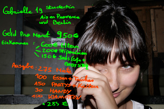 »Zeit und Geld sind in ihrem Wesen zwei sehr unterschiedliche Phänomene. Trotzdem haben sie eines gemeinsam: Sie beeinflussen und lenken das Leben der Menschen in unserer Gesellschaft«, sagt Lena Maria Loose. Zeit und Geld sind die Parameter dieser Arbeit. Beide definieren sich meist durch den Mangel – zumindest subjektiv empfunden. Lena Maria Loose hat den Portraitierten freigestellt, zu verraten, wie viel Zeit oder wie viel Geld unterm Strich bei Ihnen am Tag beziehungsweise im Monat übrig bleibt. Deren handschriftliche Bilanz wurde nachträglich in die Fotografie integriert. Am Ende lässt die Bilanz jedoch viel mehr erkennen als eine Zahl – sie gibt den Blick frei auf ein Individuum.