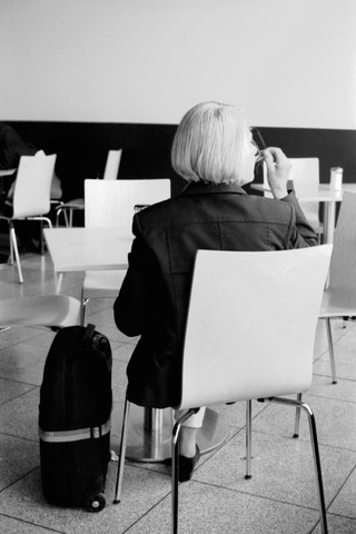 Der Flughafen ist ein Ort des Transfers und ein Ort des Termingeschäfts. Nur viele Reisende, viele Starts und Landungen bringen das Geld. Zügige Abfertigungen sind obligatorisch. Im Kontrast zu dieser Schnelllebigkeit stehen jedoch immer wieder Reisende, die einfach nur dasitzen und warten. Anna Gerlach konzentrierte sich auf dieses Verharren. Fotografie ist ein Medium, welches die Zeit anhält und einen kurzen Augenblick fixiert. In Gerlachs Bildern scheint sich dieser Augenblick in die Unendlichkeit auszudehnen.